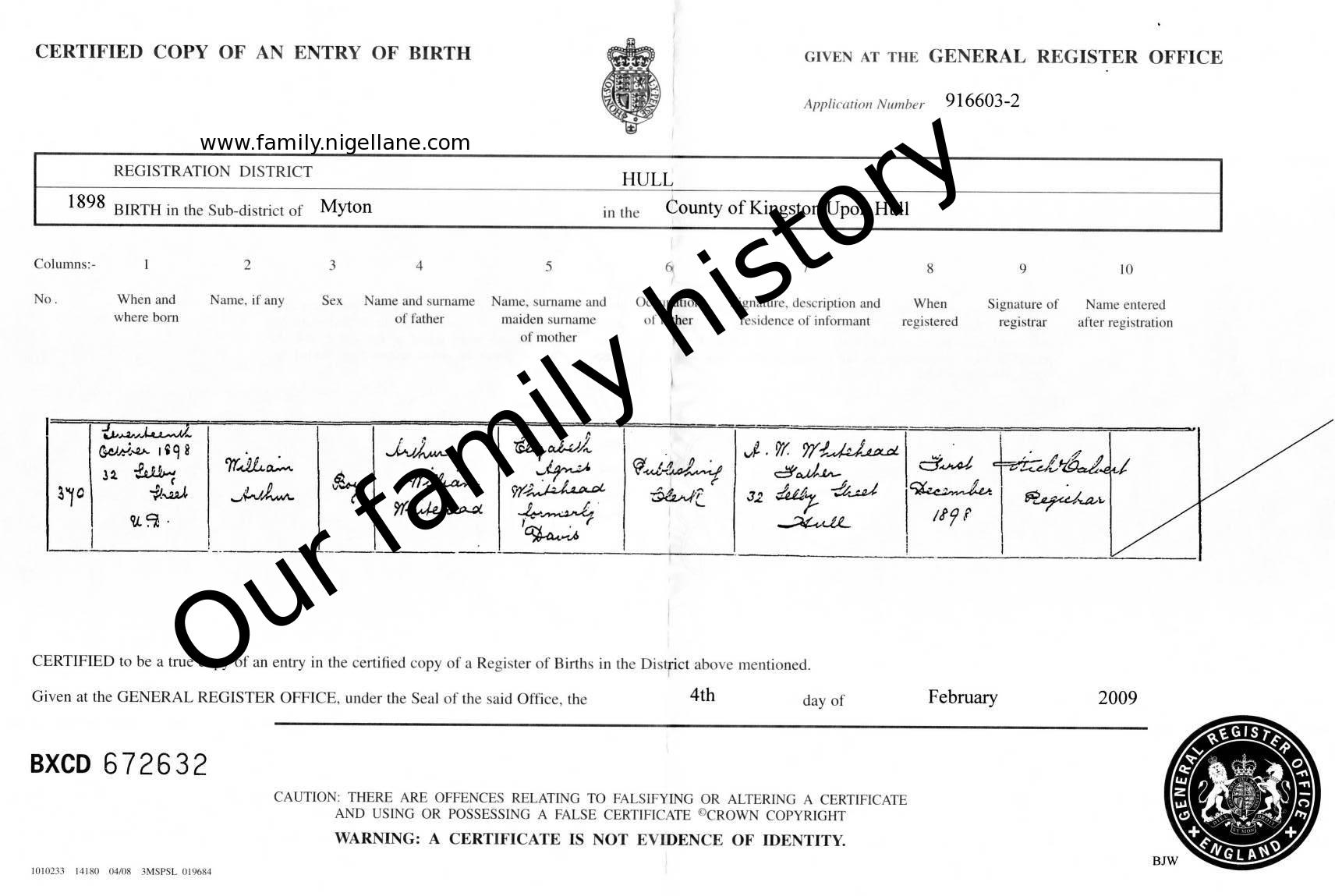 | Birth | S21 Birth Cert William Whitehead.JPG Format: image/jpeg Image dimensions: 1,712 × 1,149 pixels File size: 170 KB Type: Photo |